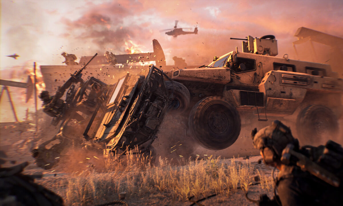 Геймплей Battlefield 6 фокусируется на тактическом взаимодействии между пехотой и техникой. Ты выбираешь один из четырёх классов бойцов — штурмовик, инженер, медик или разведчик — каждый со своим набором оружия, гаджетов и способностей. Система специалистов добавляет уникальных персонажей с особыми умениями: грэпплинг-хуки для вертикального перемещения, защитные щиты, дроны-разведчики и турели. Арсенал включает десятки реалистичных образцов современного вооружения с глубокой кастомизацией — ты меняешь прицелы, стволы, магазины и обвесы прямо во время боя через систему Plus Menu. Техника играет ключевую роль в сражениях: танки, БТРы, вертолёты, реактивные самолёты и квадрокоптеры доступны для управления. Разрушаемость окружения работает в реальном времени — здания рушатся от обстрелов, создавая новые укрытия и меняя тактику боя.